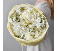 Состав: ромашка кустовая – 3 шт., пионовидная кустовая роза – 3 шт., маттиола кустовая белая – 3 шт., упаковка..